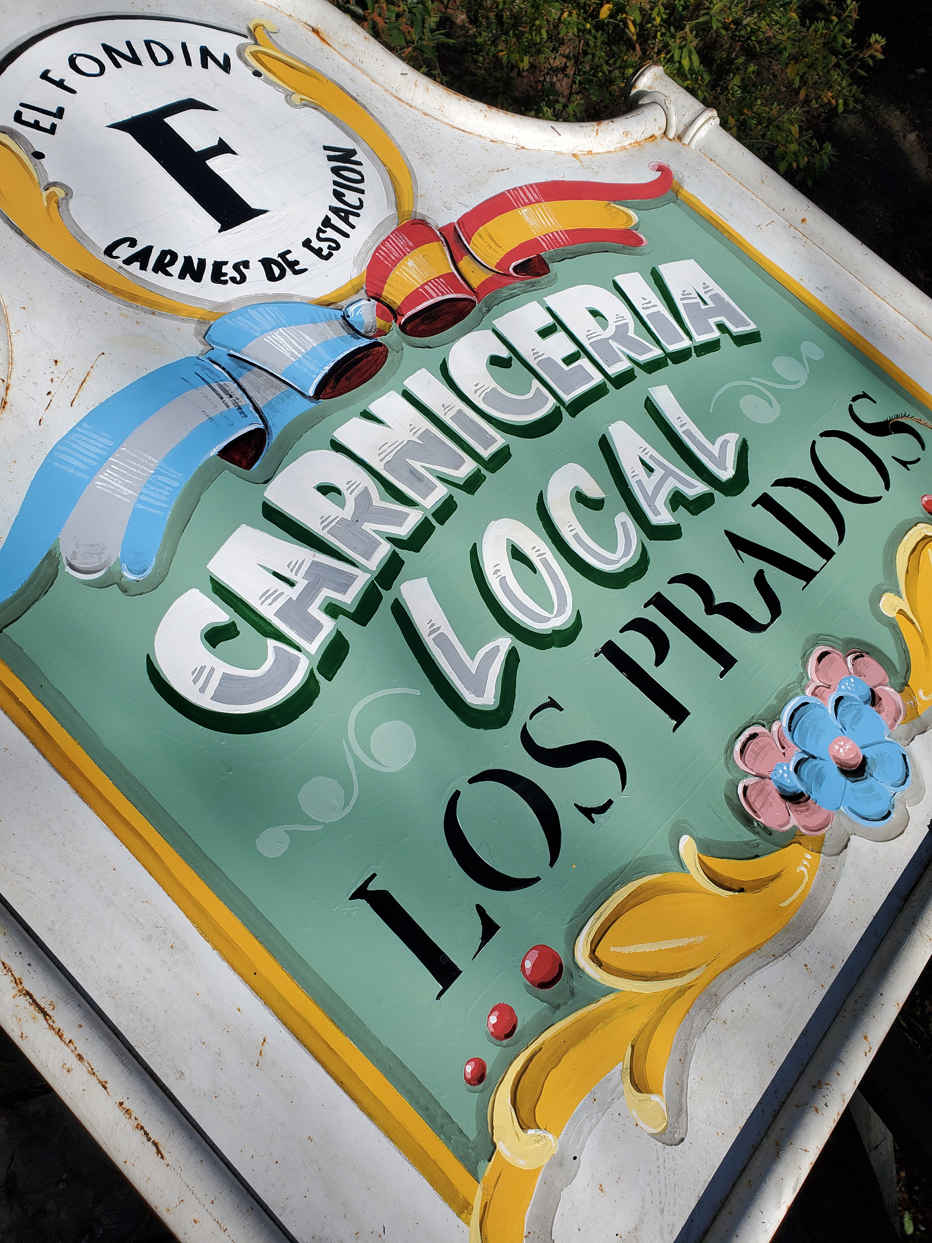 I created these two classic, recycled signs for my friend Pinky at El Fondin. Our aim was to capture a traditional, authentic local feel, so we decided to hand-paint them in the iconic 'Fileteado Porteño' style.
